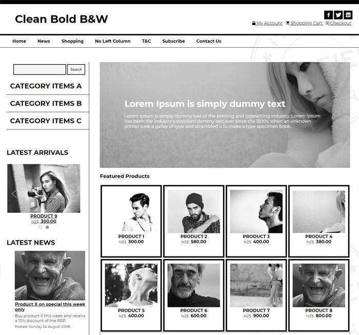 Full Width & Fresh TemplateLooking for a timeless, classic and clean template? You can't beat this! Ideal as an eCommerce store, you can add colour images and graphics should you wish. Or simply keep it black and white only. |