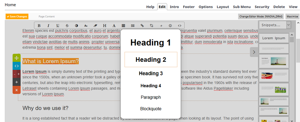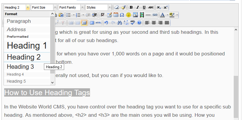 In the Website World CMS, you have control over the heading tag you want to use for a specific sub heading.