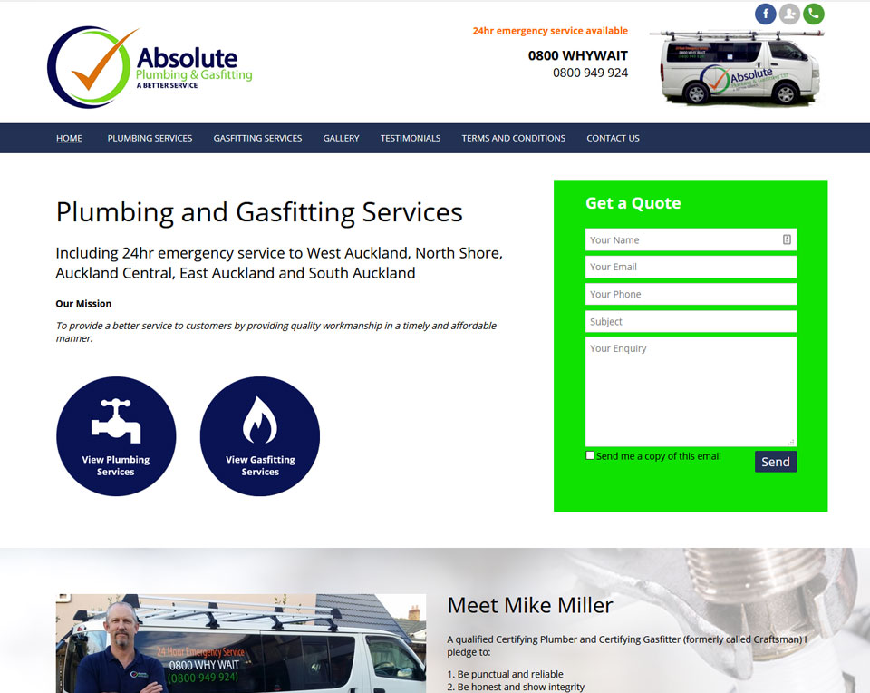 Trade focused website for Absolute Plumbing and Gasfitting Services, Auckland New Zealand.
