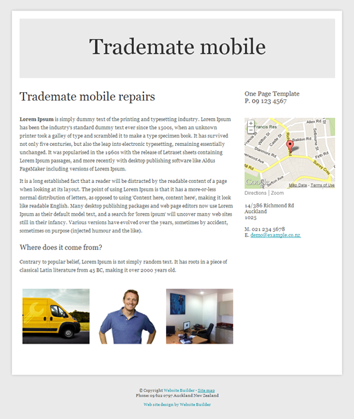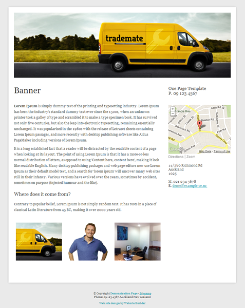 You get a professionally built one page template, with your business logo, a few photos (maybe of you or what you do) and room for some text about your business.